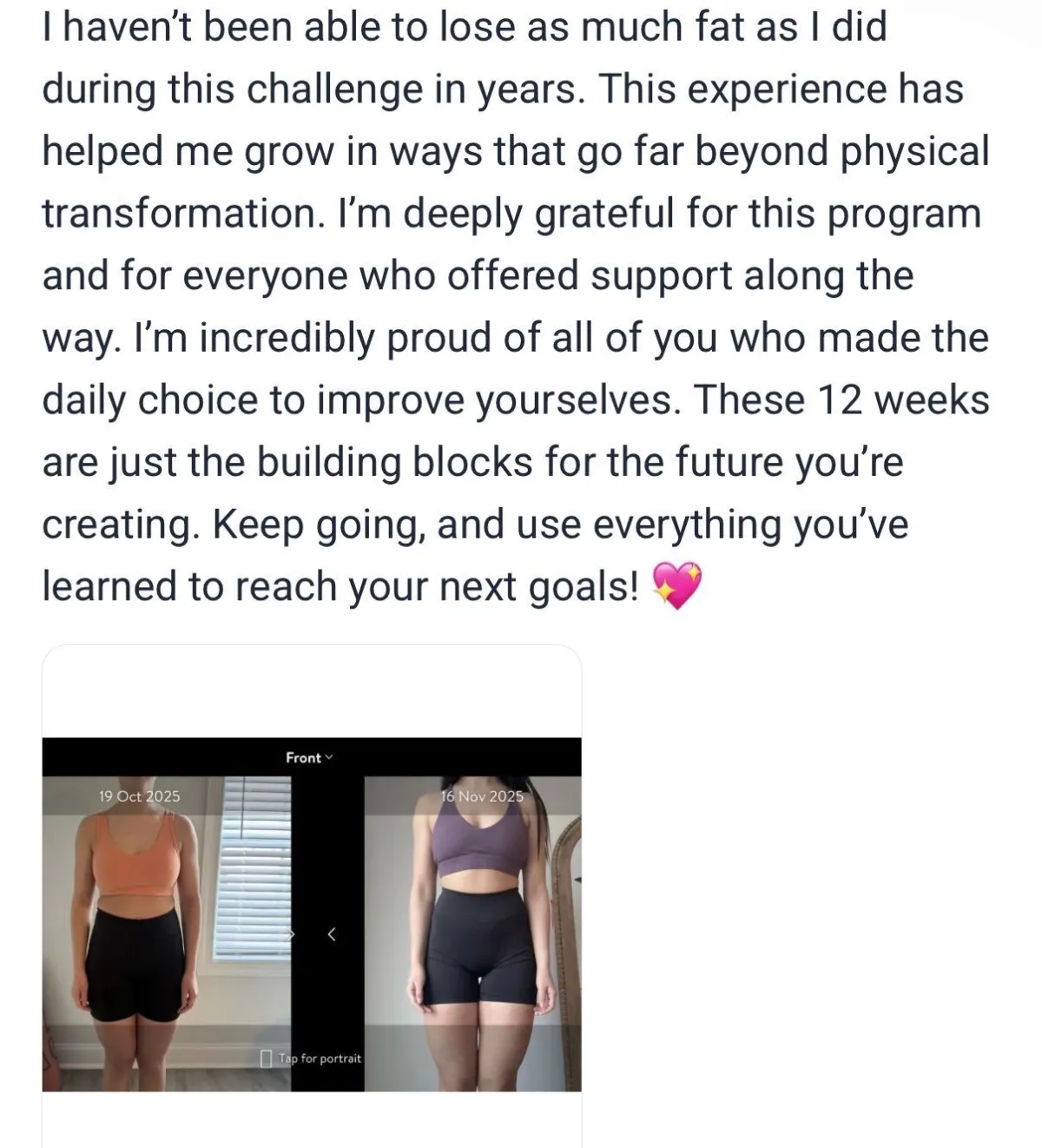 Results may vary based on individual starting point, consistency, goals, and effort. Achieving and maintaining fitness, strength, or physical changes requires regular exercise, proper nutrition, and commitment. Testimonials or examples shown are not guarantees of specific results and may reflect experiences achieved over varying timeframes or through multiple programs or methods.
